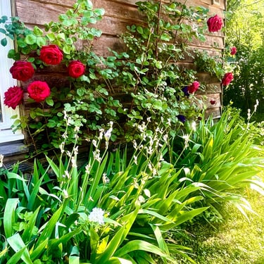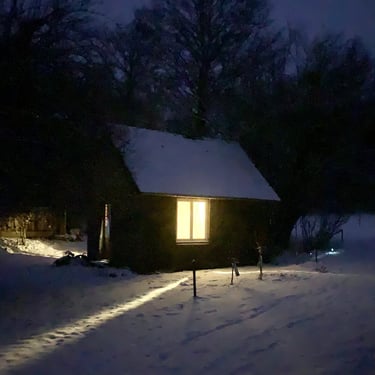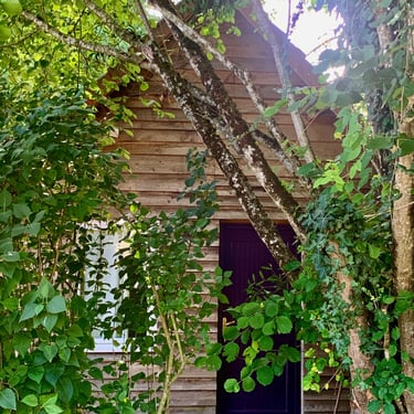 A l'ombre sous les noisetiers en été, isolé et chauffé en hiver grâce à un poêle à bois et un chauffage électrique.