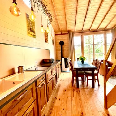 Grande pièce à vivre lumineuse, cuisine équipée, poêle à granulés pour être confortable en toute saison...